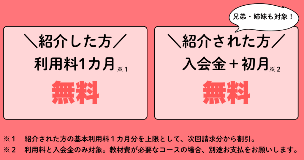 紹介された方は、入会金(11,000円)と、初月の料金が無料になるお得なキャンペーンです!