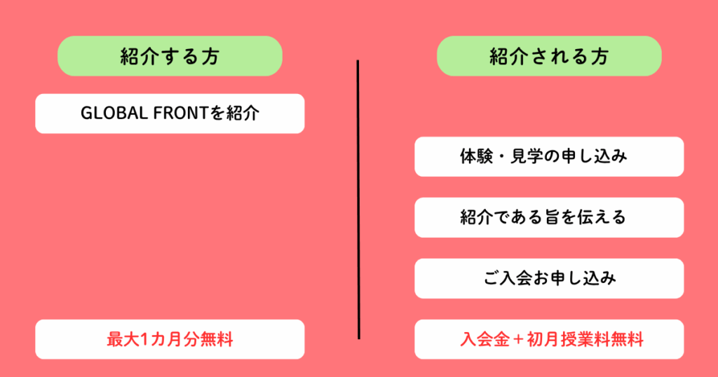 GLOBAL FRONTでは、会員のみなさまからのご紹介で、紹介した会員様も、紹介されたお友達もオトクな入会キャンペーンを実施いたします。